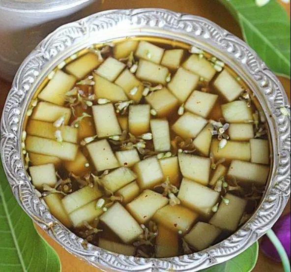 Yugadi Pachadi is made by mixing neem flowers, jaggery, raw mango pieces, tamarind pulp, salt, and a little spice.